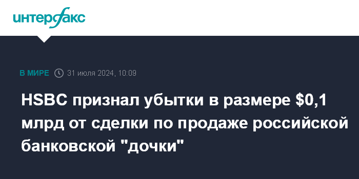 Москва. 31 июля. INTERFAX.RU - Британский HSBC признал убытки в размере $0,1 млрд от пересчета валютных резервов в результате сделки по продаже российской банковской "дочки", говорится в отчетности группы.