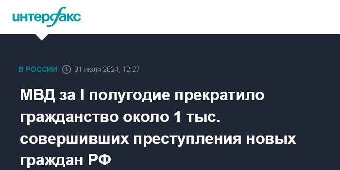 Москва. 31 июля. INTERFAX.RU - МВД России за первое полугодие 2024 года прекратило гражданство около одной тысячи граждан, добровольно приобретших российское гражданство и привлеченных к уголовной ответственности, сообщила официальный представитель ведомства Ирина Волк в среду.