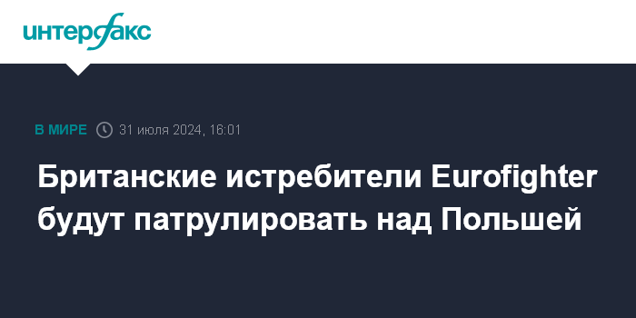 Москва. 31 июля. INTERFAX.RU - Британские истребители Eurofighter начнут патрулировать польское воздушное пространство со следующего года, заявил министр национальной обороны Польши Владислав Косиняк-Камыш. Об этом сообщает PAP.