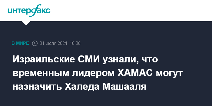 Москва. 31 июля. INTERFAX.RU - Временным лидером ХАМАС, вероятно, будет назначен Халед Машааль, который в настоящее время является одним из руководителей радикального палестинского движения за рубежом, сообщили израильские СМИ со ссылкой на палестинские источники.