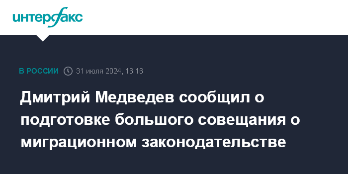Москва. 31 июля. INTERFAX.RU - Председатель партии "Единая Россия", зампред Совета Безопасности РФ Дмитрий Медведев сообщил о подготовке большого совещания по теме миграционного законодательства и пообещал навести порядок в этой теме.
