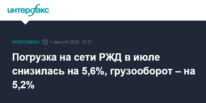 Москва. 1 августа. INTERFAX.RU - По оперативной информации, погрузка на сети ОАО "Российские железные дороги" в июле 2024 года составила 97,4 млн тонн, что на 5,6% меньше, чем за аналогичный период прошлого года, сообщила компания.