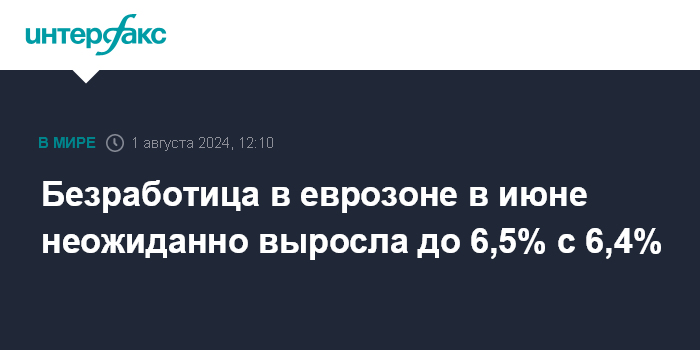 Безработица в еврозоне в июне неожиданно выросла до 6,5% с 6,4%