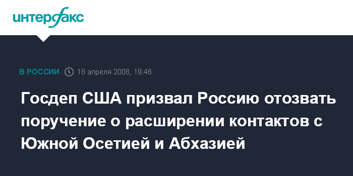 "Мы глубоко озабочены поручением российского президента от 16 апреля, позволяющим расширить контакты российского правительства и сепаратистских режимов Южной Осетии и Абхазии без согласия правительства Грузии, - заявил в пятницу пресс-секретарь государственного департамента США Шон Маккормак. - Мы призываем Россию уважать ее собственные обязательства, касающиеся признания территориальной целостности и принципов суверенитета Грузии, и аннулировать поручения от 16 апреля".
