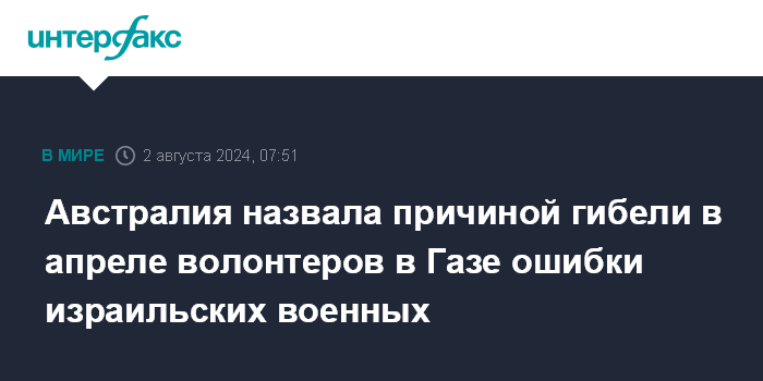 Москва. 2 августа. INTERFAX.RU - Израильский авиаудар, в результате которого погибли семь сотрудников гуманитарной организации "Всемирная центральная кухня" (World Central Kitchen), стал результатом "серьезных ошибок", сообщают австралийские СМИ со ссылкой на результаты правительственного расследования.