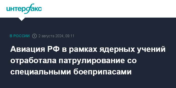 Москва. 2 августа. INTERFAX.RU - Минобороны РФ сообщило, что авиация в рамках третьего этапа нестратегических ядерных учений отработала патрулирование со специальными боеприпасами, ракетчики - снаряжение ракет-носителей и выход в позиционный район.