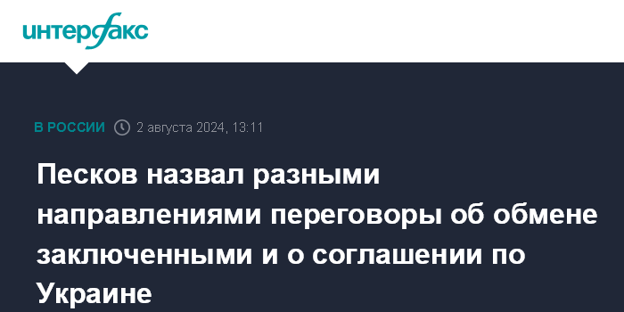 Москва. 2 августа. INTERFAX.RU - Процесс обмена заключенными, который состоялся накануне между Россией, США и рядом западных стран и вопрос заключения мирного соглашения по Украине - это разные направления работы, заявили в Кремле.
