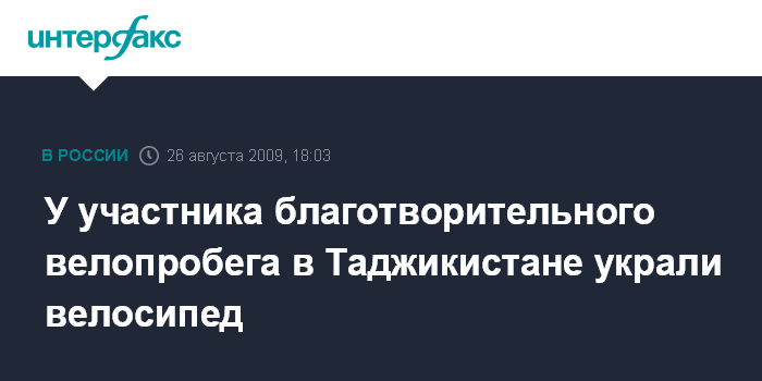 Душанбе. 26 августа. INTERFAX.RU - В Таджикистане угнали велосипед у одного из двух европейцев, совершающих благотворительный велопробег Осло-Пекин, сообщил "Интерфаксу" представитель фонда Eurasia Набишер Джураев.