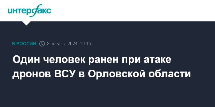 Москва. 3 августа. INTERFAX.RU - Один человек пострадал при атаке украинских дронов в Орловской области, сообщил губернатор Андрей Клычков.