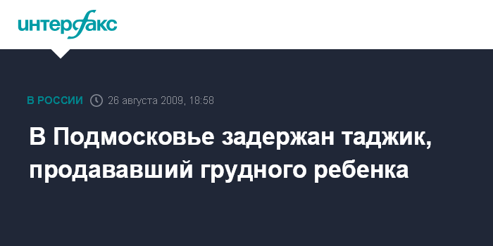 Москва. 26 августа. INTERFAX.RU - В подмосковном городе Истра задержан гражданин Таджикистана, пытавшийся продать грудного ребенка, сообщил в среду "Интерфаксу" источник в правоохранительных органах.