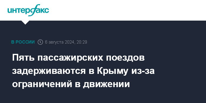 В частности, по состоянию на 20:00 задерживаются поезда №175/176 Москва Павелецкая - Симферополь (отправился 5 августа, задерживается на 2 часа 30 минут), №017/018 Москва - Симферополь (отправился 5 августа, задерживается на 30 минут), №27/28 Симферополь - Москва (отправился 6 августа, задерживается на 2 часа 30 минут), №179/180 Евпатория - Санкт-Петербург (отправился 6 августа, задерживается на 1 час 30 минут), №007/008 Севастополь - Санкт-Петербург (отправился 6 августа, задерживается на 50 минут).