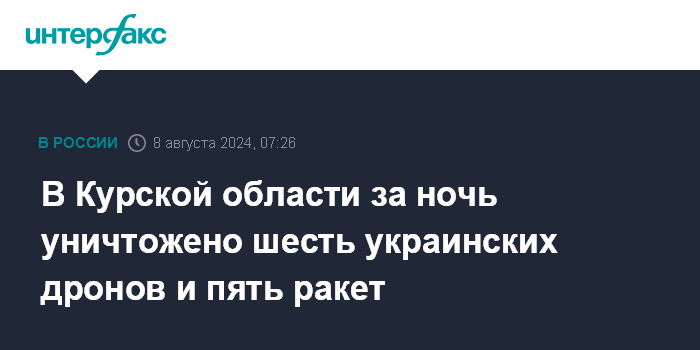 Москва. 8 августа. INTERFAX.RU - Врио губернатора Курской области Алексей Смирнов сообщил об уничтожении шести беспилотников и пяти ракет ВСУ над регионом.