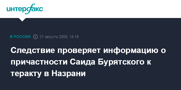 Москва. 27 августа. INTERFAX.RU - Следствие проверяет причастность боевика, известного под кличкой Саид Бурятский, к взрыву у здания ОВД в Назрани 17 августа, сообщили в четверг "Интерфаксу" в Следственном комитете при прокуратуре РФ.