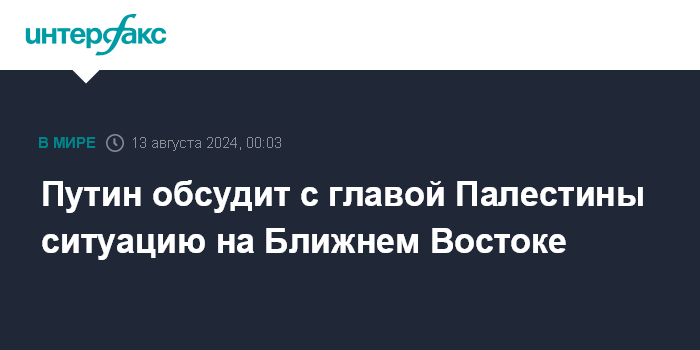 Москва. 13 августа. INTERFAX.RU - Президент РФ Владимир Путин во вторник проведет переговоры с главой Палестины Махмудом Аббасом.