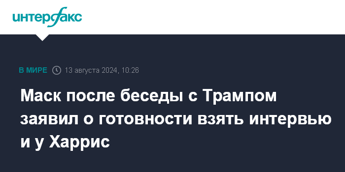 Ранее он взял интервью у Трампа, в ходе которого Маск задал вопросы кандидату в президенты как относительно внутренней, так и внешней политики.