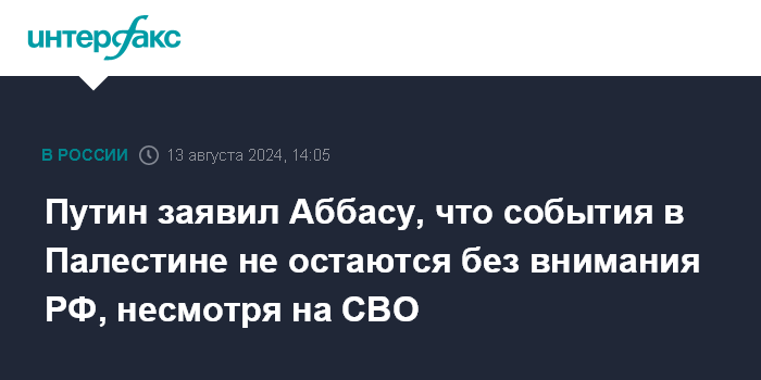 Москва. 13 августа. INTERFAX.RU - Президент РФ Владимир Путин заявил, что, несмотря на ситуацию, связанную с необходимостью ведения специальной военной операции, происходящие в Палестине события не остаются без внимания России.