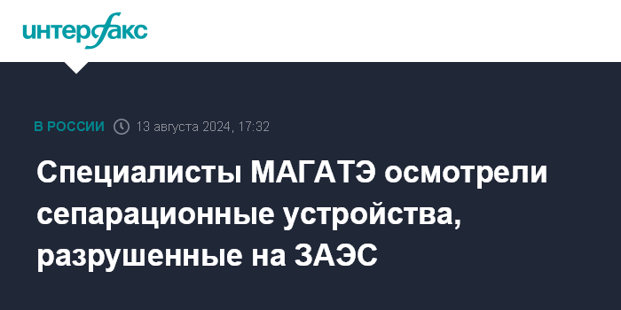 Москва. 13 августа. INTERFAX.RU - Эксперты Международного агентства по атомной энергии (МАГАТЭ) повторно осмотрели градирню Запорожской АЭС, пострадавшую от удара ВСУ, сообщили во вторник представители станции.