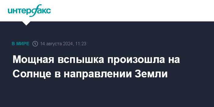 Москва. 14 августа. INTERFAX.RU - Вспышка максимального уровня мощности зафиксирована на Солнце, центр взрыва находится на линии в направлении Земли. Об этом сообщили в среду в лаборатории солнечной астрономии Института космических исследований РАН и Института солнечно-земной физики Сибирского отделения РАН.