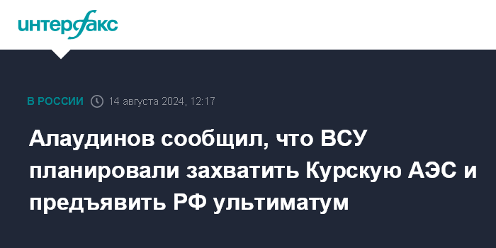 Москва. 14 августа. INTERFAX.RU - Украинские формирования планировали к 11 августа захватить Курскую атомную электростанцию, в атаке на Курскую область было задействовано более 11 тыс. военнослужащих ВСУ, однако этот план провалился, сообщил заместитель начальника главного военно-политического управления Вооруженных сил РФ Апты Алаудинов, который командует спецназом "Ахмат".