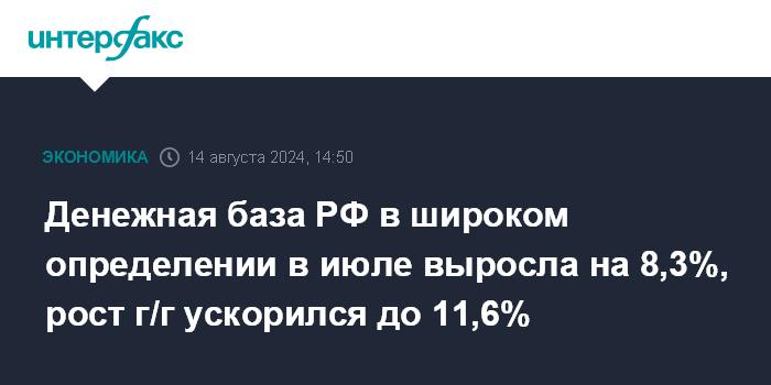 Денежная база РФ в широком определении в июле выросла на 8,3%, рост г/г ускорился до 11,6%