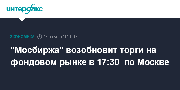 Москва. 14 августа. INTERFAX.RU - Торги на фондовом рынке "Московской биржи" возобновятся с 17.30 по московскому времени, сообщила торговая площадка.