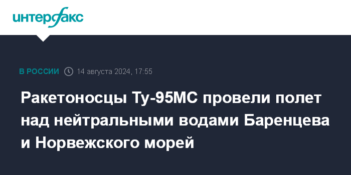 Москва. 14 августа. INTERFAX.RU - Два стратегических ракетоносца Ту-95МС выполнили плановый полет в воздушном пространстве над нейтральными водами акваторий Баренцева и Норвежского морей, сообщили в Минобороны России.