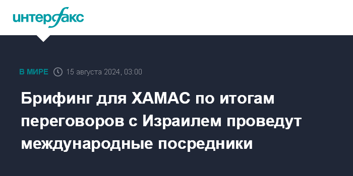 Москва. 15 августа. INTERFAX.RU - Международные посредники на переговорах по прекращению огня в секторе Газа проведут брифинг для представителей палестинского движения ХАМАС сразу после встречи с израильскими переговорщиками, сообщает Bloomberg.