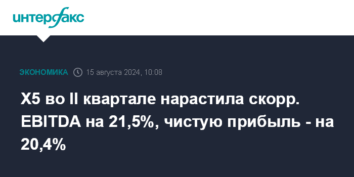 Москва. 15 августа. INTERFAX.RU - Скорректированная EBITDA ПАО "Корпоративный центр Икс 5" (X5) во II квартале 2024 года увеличилась по сравнению с аналогичным периодом прошлого года на 21,5% - до 73,64 млрд рублей, говорится в сообщении компании.