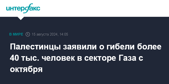 Москва. 15 августа. INTERFAX.RU - В секторе Газа с начала операции Армии обороны Израиля (ЦАХАЛ) в октябре прошлого года погибли более 40 тыс. человек, сообщает в четверг "Аль-Джазира" со ссылкой на палестинские службы здравоохранения.