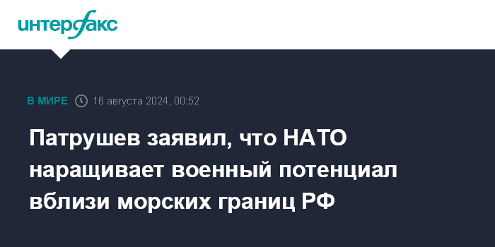 Москва. 16 августа. INTERFAX.RU - Страны Североатлантического альянса во главе с США наращивают военно-морское присутствие в акваториях океанов и морей, прилегающих к территории России, заявил председатель Морской коллегии РФ, помощник президента России Николай Патрушев.