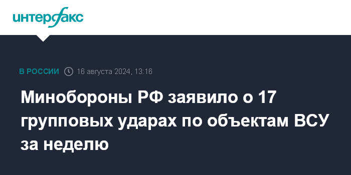 Москва. 16 августа. INTERFAX.RU - Вооружённые силы России за неделю нанесли 17 групповых ударов по предприятиям ВПК Украины, аэродромной инфраструктуре и местам сборки и хранения ударных беспилотников противника, сообщило министерство обороны РФ в пятницу.