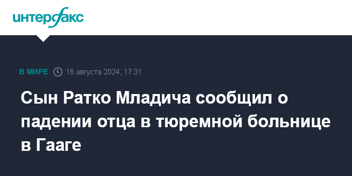 Москва. 16 августа. INTERFAX.RU - Бывший командующий силами боснийских сербов Ратко Младич потерял создание и упал, травмировав голову в тюремной больнице в Гааге, сообщил сербским СМИ его сын Дарко Младич.