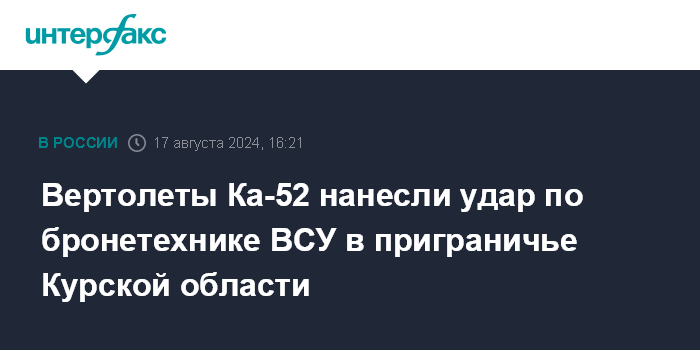 Москва. 17 августа. INTERFAX.RU - Экипажи армейской авиации на вертолетах Ка-52 нанесли удар по бронированной военной технике подразделений вооруженных сил Украины в приграничном районе Курской области, сообщило министерство обороны РФ в субботу.