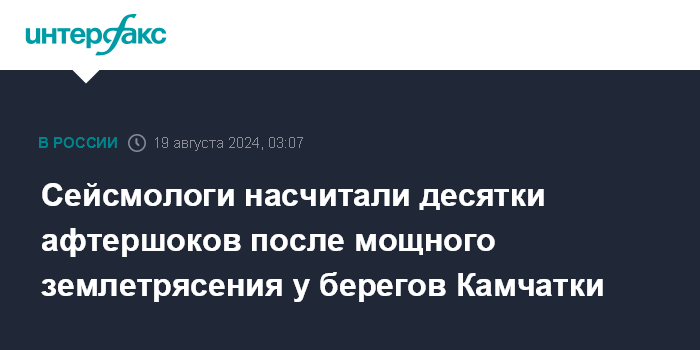 Москва. 19 августа. INTERFAX.RU - Более 30 афтершоков зарегистрировано после мощного землетрясения, которое случилось в воскресенье у восточного побережья Камчатки, сообщается на сайте Камчатского филиала Геофизической службы РАН в понедельник.