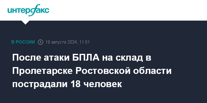 Москва. 19 августа. INTERFAX.RU - В результате атаки БПЛА в Пролетарском районе Ростовской области, где загорелся склад с дизельным топливом, пострадали 18 человек, сообщает пресс-служба районной администрации