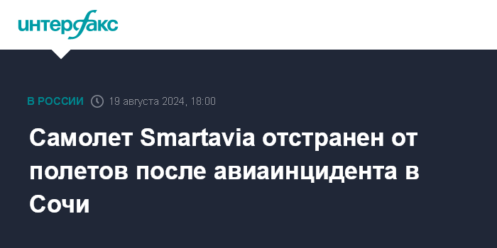 Москва. 19 августа. INTERFAX.RU - В аэропорту Сочи самолет Smartavia, прилетевший из Петербурга, при посадке коснулся взлетно-посадочной полосы задней частью фюзеляжа, сообщил журналистам представитель Росавиации. Самолет отстранен от полетов для оценки технического состояния.