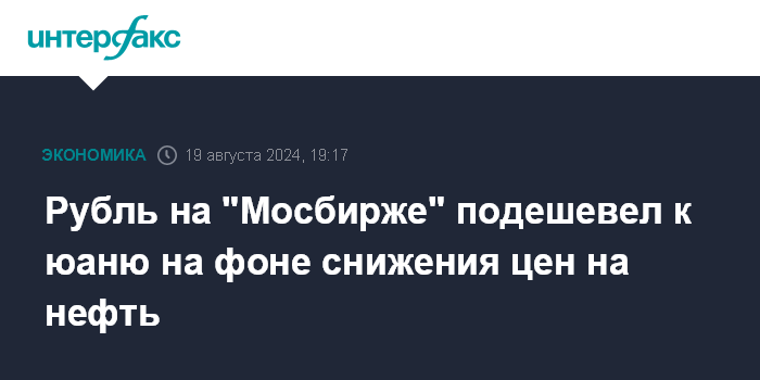 Москва. 19 августа. INTERFAX.RU - За торги понедельника на "Мосбирже" рубль подешевел к юаню на фоне снижения котировок нефти. Юань к 19:00 дорожал на 3,2 копейки, до 12,1 рубля.
