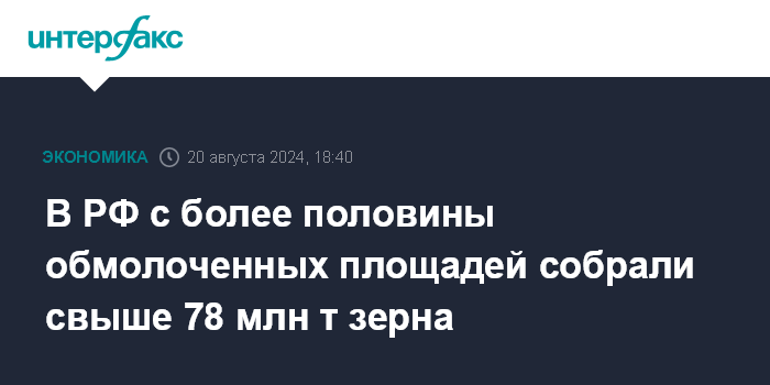 Москва. 20 августа. INTERFAX.RU - Аграрии РФ с более половины обмолоченных площадей собрали свыше 78 млн тонн зерна.
