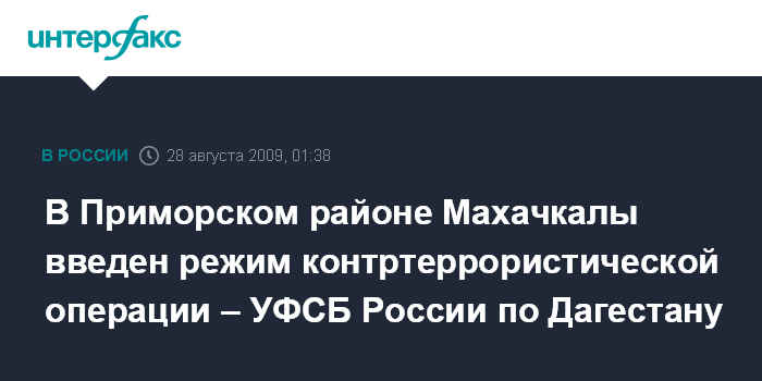 Махачкала. 28 августа. ИНТЕРФАКС-ЮГ - Режим контртеррористической операции введен в ночь на пятницу в Приморском районе Махачкалы, сообщили агентству "Интерфакс-Юг" в группе общественных связей (ГОС) УФСБ России по Дагестану.