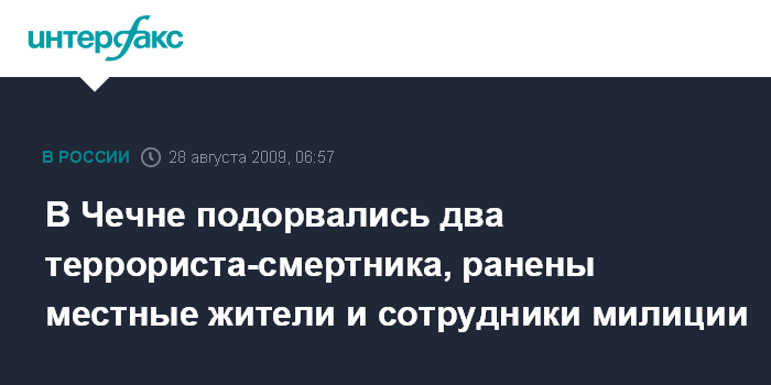 Ростов-на-Дону. 28 августа. ИНТЕРФАКС-ЮГ - Два террориста-смертника совершили теракт в Чечне, при этом пострадали трое милиционеров и трое местных жителей, сообщили агентству Интерфакс-ЮГ в штабе объединенной группировки войск на северном Кавказе.