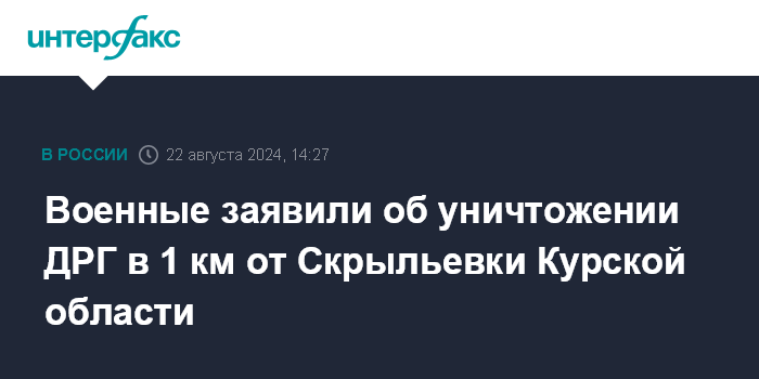 Москва. 22 августа. INTERFAX.RU - Российские военные обнаружили и уничтожили диверсионно-разведывательную группу (ДРГ) вооруженных сил Украины в километре от Скрыльевки в Курской области, заявили в Минобороны РФ.