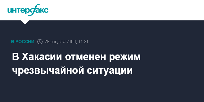 Москва. 28 августа. INTERFAX.RU - Режим чрезвычайной ситуации, введенный в республике Хакасия в связи с аварией на Саяно-Шушенской ГЭС, в пятницу снят, сообщили агентству "Интерфакс-Сибирь" в пресс-службе республиканского правительства.