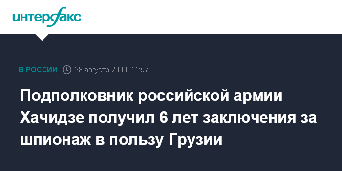 Москва. 28 августа. INTERFAX.RU - К шести годам лишения свободы в колонии строго режима приговорен за государственную измену в форме шпионажа подполковник российской армии Михаил Хачидзе, работавший на спецслужбы Грузии.