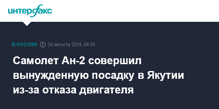 Москва. 24 августа. INTERFAX.RU - Самолет Ан-2, вылетевший из поселка Солнечный Усть-Майского района, совершил вынужденную посадку в 5 км от поселка, сообщает пресс-служба ГУ МЧС России по Якутии.