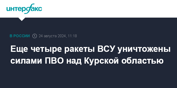 "Еще четыре украинские ракеты утром уничтожены в небе Курской области", - написал он в своем телеграм-канале в субботу.