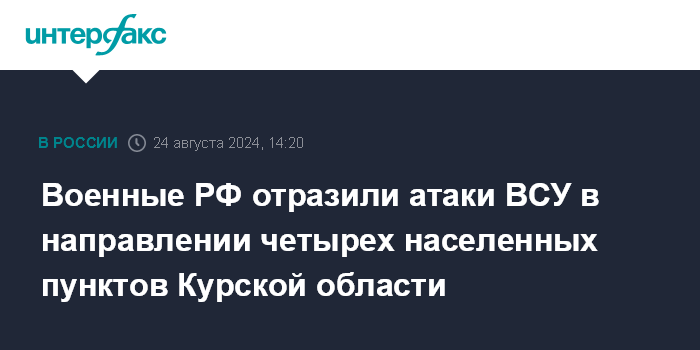 Москва. 24 августа. INTERFAX.RU - Российские военные отразили атаки штурмовых групп вооруженных сил Украины (ВСУ) в направлении населенных пунктов Борки, Спальное, Черкасское Поречное и Малая Локня Курской области, заявили в Минобороны РФ в субботу.