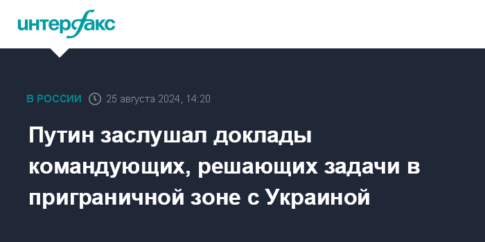 Москва. 25 августа. INTERFAX.RU - Президент РФ Владимир Путин накануне поздно вечером заслушал доклады командующих, решающих боевые задачи на приграничных с Украиной территориях, сообщили в воскресенье в пресс-службе главы государства.