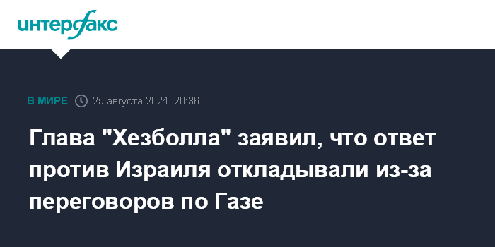 Москва. 25 августа. INTERFAX.RU - В "Хезболле" временили с осуществлением атаки на Израиль в связи с проведением переговоров по урегулированию в секторе Газа, примут решение по новым ударам позднее, заявил лидер движения Хасан Насралла, которого цитирует Press TV.
