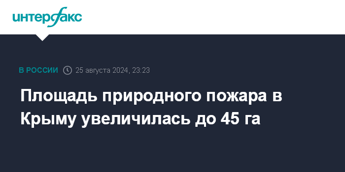 Москва. 25 августа. INTERFAX.RU - Площадь природного пожара в Крыму выросла до 45 гектаров, сообщили в пресс-службе МЧС России.