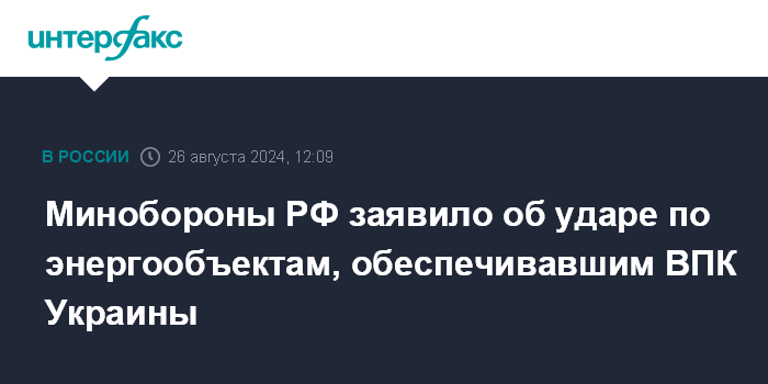 Москва. 26 августа. INTERFAX.RU - Российские военные сообщили о нанесении массированного удара высокоточным оружием, беспилотниками по критически важным объектам энергетической инфраструктуры, обеспечивавшим работу военно-промышленного комплекса (ВПК) Украины.